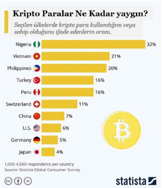 Türkiye, dünyada kripto parayı en çok kullanan ülkeler sıralamasında Nijerya, Vietnam ve Filipinler’in arkasından dördüncü sırada geliyor. Gelişmiş ülkeler belirsizlikten uzak dururken, üçüncü dünya ülkeleri bu tuzağa gözü kapalı dalmış durumda. Geçmişte Arjantin’de yüksek enflasyondan korunmak ve hükümetin bankadaki tasarruflara el koyabileceği korkusuyla insanlar tasarruflarını kripto paralara aktarmıştı. 2012-2013 yıllarında Güney Kıbrıs Rum Yönetimi’nde yaşanan finansal kriz sırasında da insanlar aynı endişelerle kripto paralara yönelmişti. Benzer bir durum son birkaç yıldır Türkiye’de de yaşanıyor.
