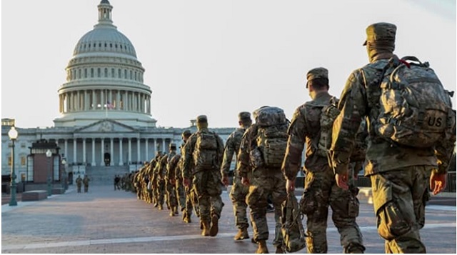 Birleşik Devletler Ulusal Muhafızlarına mensup askerlerin 12 Ocak 2021 tarihinde Washington DC kentinde bulunan Kongre Binasına gelişi. Fotoğraf: Tasos Katopodis/Getty Images