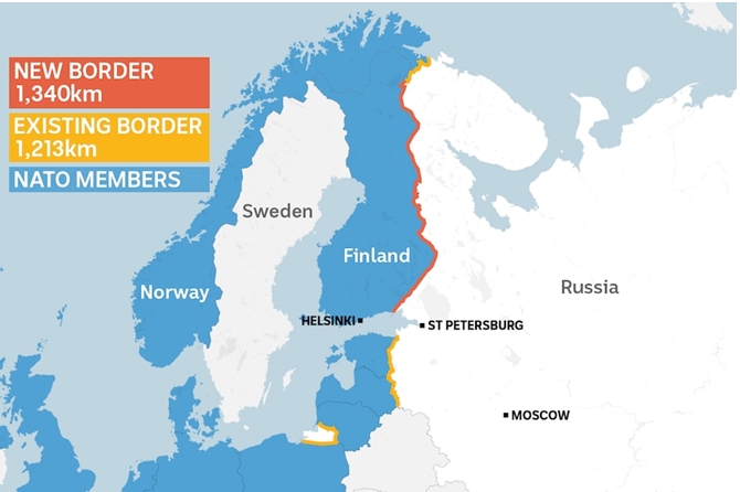 Finlandiya’nın NATO’ya katılımı ile ABD liderliğindeki NATO ittifakının Rusya ile kara sınırı 1,340 kilometreye çıkmıştır. Grafik: ABC News, Jarrod Frankhauser.