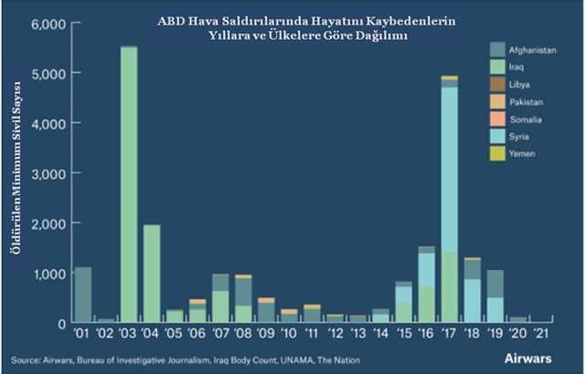 Şiddetli çatışma bölgelerinde sivillere verilen zararları izleyen ve azaltmak için çaba Londra merkezli kâr amacı gütmeyen bir kuruluş olan Airwars tarafından yayınlanan bir rapora göre, ABD’nin 11 Eylül 2001 tarihinden itibaren gerçekleştirdiği hava saldırılarında en az 22.000 sivil hayatını kaybetmiştir. Sözde (!) 11 Eylül terör eylemlerinin ardından başlayan Terörle Savaş operasyonlarının 20’nci yıldönümünde hayatını kaybeden sivillerin sayısı 48.000 kadar olabilir.