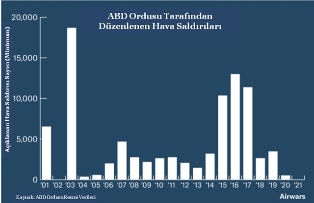 Pentagon, son 20 yılda Afganistan, Irak, Libya, Pakistan, Somali, Suriye ve Yemen’de en az 91.340 hava saldırısı gerçekleştirdiğini açıklamıştır. ABD ordusunun işgal ettiği veya bomba ya da insansız hava araçlarıyla saldırdığı bu yedi ülkeye düzenlediği hava saldırıları; 2003 yılı Irak işgali ile 2015-2017 yılları arasında Irak, Suriye ve Libya’da İslami Devlet terör örgütüne düzenlenen saldırılar esnasında zirve yapmıştır.