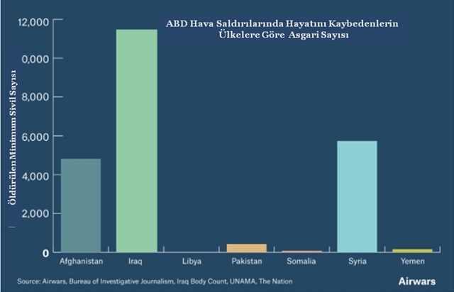 Bağımsız Airwars gözlem kuruluşuna göre; teröre karşı yürütülen savaşta rapor edilen sivil ölümlerin %97’si; Irak, Afganistan ve Suriye’de meydana gelmiştir.