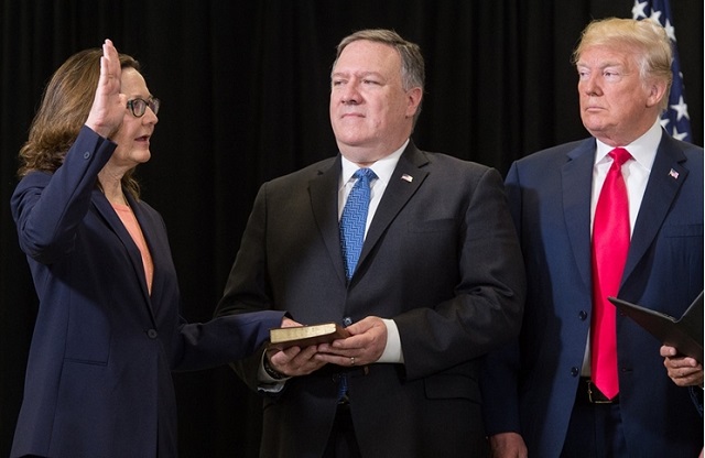 Gina Haspel yanında Trump ve Pompeo ile CIA Direktörlüğü görevine başlama öncesinde CIA Merkezinde düzenlenen yemin töreninde görülmektedir. 21 Mayıs 2018. Fotoğraf: Saul Loeb/AFP/Getty Images.