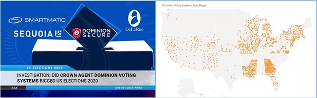 Oy makinesi pazarının üçte birinden fazlasına hâkim olan Dominion şirketiyle ilgili iddiaların çoğu; tabiri caizse büyük meydan savaşlarının sürdüğü; Arizona, Georgia, Michigan, Nevada, North Carolina, Pennsylvania ve Wisconsin eyaletlerinde, Seçim Günü, gece yarısından sonra gizemli bir şekilde oy sayım işlemini durdurmasıdır. Oy sayım işlemi durduğunda Başkan Trump bu eyaletlerde seçim yarışını, bazen yüz binlerce oy farkla önde götürmektedir. Ertesi sabah ise, gün doğmadan önceki, bazı durumlarda %100’ü Joe Biden’e verilen oylar nedeniyle, eski Başkan Yardımcısı görünüşe göre zaferini ilan etmiş gibi görünmektedir.