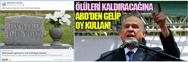 Solda; ‘‘Ben Oy Verdim. Ya Siz?’’ diye soran Amerikalı bir ölü, sağda ise Fethullah Gülen’in ‘‘İmkân olsa mezardakileri bile kaldırarak referandumda evet oyu kullandırmak lazım” sözlerine öfkelenen MHP Genel Başkanı Devlet Bahçeli. Kaynak: İLKE HABER