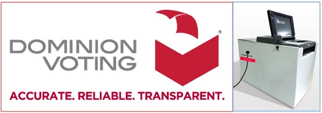 Solda başkanlık seçimlerinde kullanılan oy makinelerini imal eden şirketin reklam logosu, ‘‘DOMINION VOTING: HASSAS. GÜVENİLİR, ŞEFFAF’’, sağda ise oy makinesinin alt parçalarından ‘‘Tablolama Makinesi’’ görülmektedir. Portatif bir tarayıcı olan Tablolama makinesi seçmenin oyunu okur, kaydeder, oy sandığı içine depolar ve oy verme işlemi bittikten sonra da seçim sonuçlarını oluşturur. Kaynak: Dominion Voting Systems.