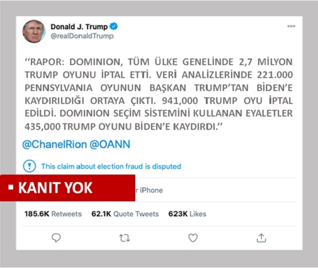 12 Kasım 2020 tarihinde Başkan Trump, yukarıda görülen mesajı Twitter sosyal medya hesabında paylaşmıştır. Başkan Trump’ın, ülke genelinde 2,7 milyon oyunun çalındığını ve kendisine verilen oyların Biden’e kaydırıldığını iddia eden Twitter mesajı yukarıdadır.
