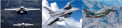 Soldan sağa: F-35 Lightning II, F-16 Blok 70 ve Tranch 1 Eurofighter Typhoon savaş uçakları.