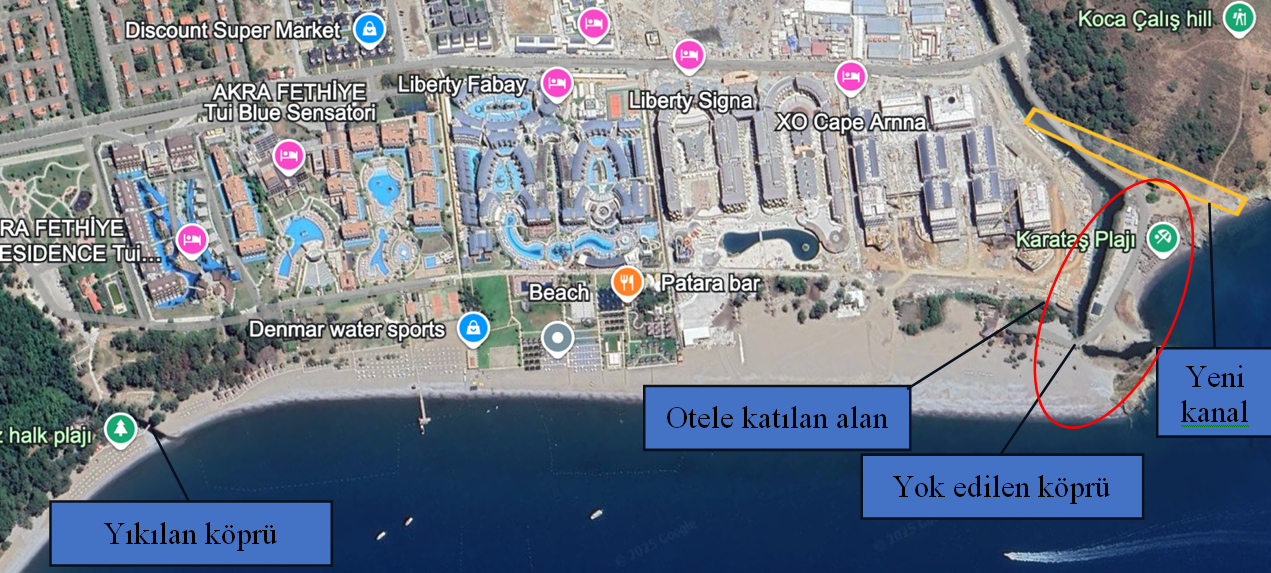 Dere, Koca Çalış tepesi oyularak doğuya kaydırılmış ve Karataş Plajı otel arazisine katılmış. Eski dere yatağı doldurularak otel kullanımına sunulmuş.