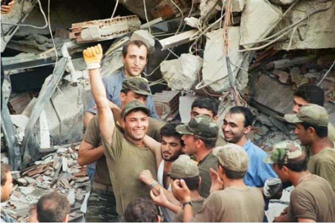 Askeri birlikler geçmişten beri doğal afetlerde kurtarma çalışmalarında önemli rol oynamaktadır, fotoğrafta 17 Ağustos 1999 depreminde enkaz altında kalan birini çıkaran askerlerin sevinci görülmektedir. Kaynak Independent