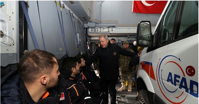Silahlı kuvvetleri olarak Milli Savunma olarak bütün arkadaşlarımızla çalışmalara başladık. Bunun ilk adımı olarak da bakanlığımızda bir kriz merkezi oluşturduk. 17 uçakla büyük uçaklar dahil bir hava yardım koridoru oluşturduk. İhtiyaç duyulduğunda kullanılmak üzere Akıncı TİHA’larda görevlendirildi. İhtiyaç duyulan tüm personeli bu uçaklarla ihtiyaç duyulan bölgelere ulaştırmaya gayret gösterdik. Maalesef hava şartlarındaki olumsuzluk nedeniyle ve bazı hava meydanlarımızdaki depremin verdiği hasardan dolayı şu ana kadar büyük gayretle arkadaşlarımızı ulaştırabilecekleri personeli yerlerine ulaştırdılar. Sekiz adet doğal afet timi de şu anda bölgeye intikal etmiş durumdalar. TCK İskenderun gemisini görevlendirmek suretiyle saatlerinde İskenderun havalimanına yanaşacak bütün yaralılarımızı sevk etmek suretiyle inşallah en kısa zamanda en kısa hastaneye sevkimizi mümkün kılacağız.