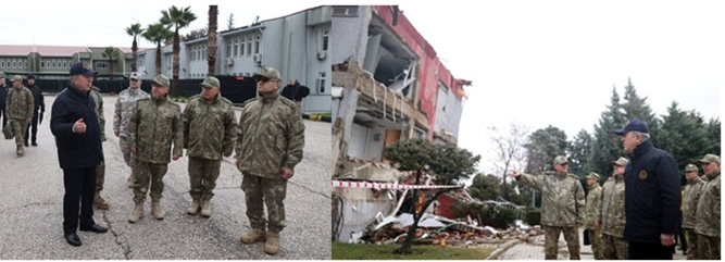 06 Şubat 2023 – 18.07: Millî Savunma Bakanı Hulusi Akar beraberinde Genelkurmay Başkanı Org. Yaşar Güler ve Kara Kuvvetleri Komutanı Org. Musa Avsever ile Hatay’a gitti. Bakan Akar, Serinyol’da üç askerin şehit olduğu 8’inci Komando Tugay Komutanlığında incelemelerde bulundu.