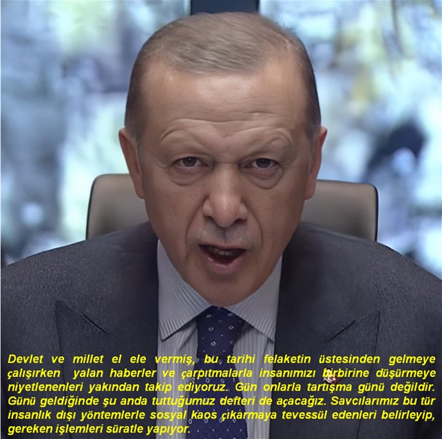 Ve sonuç olarak; bizim şu anda yapmaya çalıştığımız en önemli konu, olabildiğince enkaz altında kalan personelimize ulaşabilmek, diğer taraftan da bölgede valilerle arkadaşlarım gerekli koordinasyonu sağladılar. Valilikten gelen, valilerden gelen, valiliklerden gelen taleplere de en üst düzeyde cevap vermek suretiyle, karşılamak suretiyle ihtiyaçları, çalışmalarımızı sürdürüyoruz.
