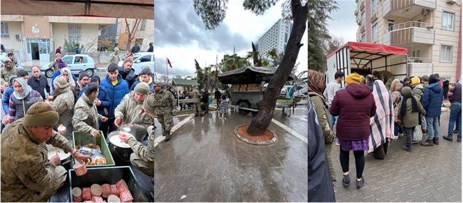 06 Şubat 2023 – 15.18: Meydana gelen deprem sonrası Malatya 2’nci Ordu Komutanlığımızda görevli Mehmetçiklerimiz, arama-kurtarma çalışmalarının sürdüğü noktalarda yemek dağıtarak vatandaşlarımıza destek sağlıyor. Birliklerimiz tarafından ayrıca deprem bölgesinde seyyar mutfak desteği de sağlanacak.