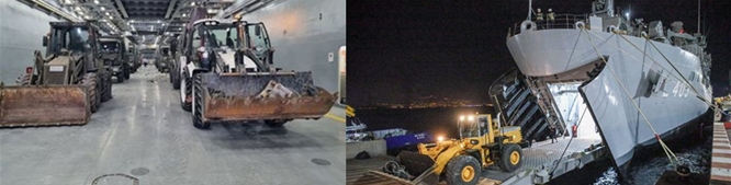 İş makineleri, giyecek, gıda ürünleri ve sağlık donanımı taşıyan TCG Bayraktar İskenderun Limanı’nda, Fotoğraf: AA
