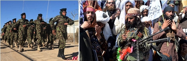 Solda Afgan Ulusal Ordusuna katılan kadın askerler, sağda ise Taliban unsurları. Kaynaklar: The Asian ve AFP