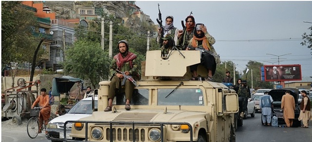Pentagon tarafından ‘‘kullanılamaz’’ hale getirildiği iddia edilen bir Humvee zırhlı aracıyla devriye gezen Taliban terör örgütü militanları, 31 Ağustos 2021. Fotoğraf: Hoshang Hashimi/AFP via Getty Images