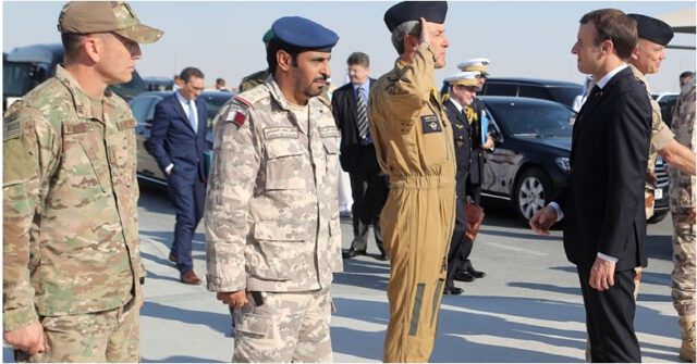 Katar’ın Al-Udeid Hava Üssü Afganlı askerlerin eğitiminde kullanılabilir mi? Fotoğrafta; Fransa Cumhurbaşkanı Emmanuel Macron Katar’ın başkenti Doha’da bulunan üsse yaptığı ziyarette ABD, Katar ve Fransız komutanlar tarafından karşılanırken görülmektedir. 07 Aralık 2017. Fotoğraf: Karim Jaafar/ AFP via Getty Images.