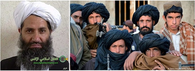 Solda Taliban savaşçılarının lideri Mullah Hibatullah Akhunzada bilinmeyen bir yer ve zamanda kameralara poz verirken, sağda ise Taliban savaşçıları görülmektedir. Kaynaklar: VoA News ve Getty Images.