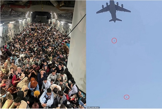 Kabil’den havalanan ve içinde Afganlı 640 mülteciyi taşıyan C-17 modeli uçak Katar’a zorunlu iniş yapmak zorunda kalmıştır. Kabil’den kalkış esnasında uçağa tutunan üç Afganlı, uçak kalkış için pistte hızlanırken düşerek tekerlekleri altında can vermiş, iniş tekerlekleri yuvasına giren bazı ümitsiz ve zavallı Afganlıların ise uçak tırmanışa geçtiğinde düştüğü görülmüştür.