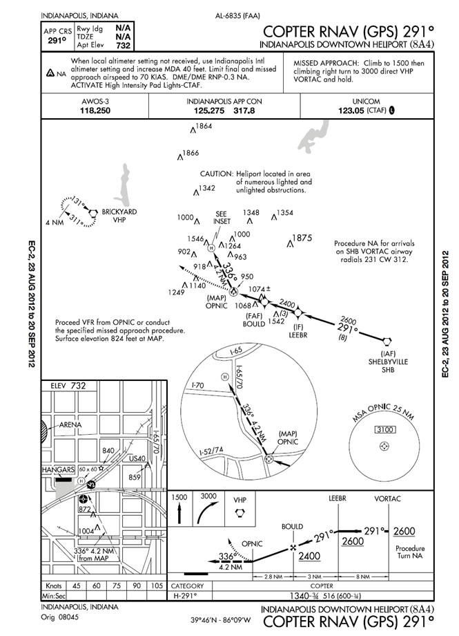 Indianapolis Downtown Heliportu için hazırlanan ve 291 derece istikametinde alçalmayı sağlayan bir COPTER RNAV (GPS) alçalma kartı.