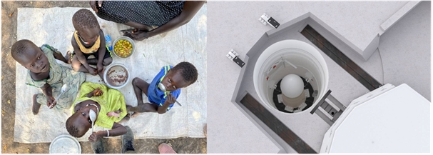 Solda Güney Sudan’da açlık tehlikesiyle burun buruna olan çocuklar, sağda ise nükleer füze harp başlığının kuşbakışı görünüşü. Kaynaklar: WFP/Marwa Awad ve Northrop Grumman.