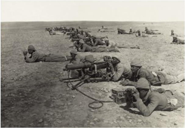 İkinci Gazze Savaşı esnasında Gazze hattını savunan bir Osmanlı makineli tüfek birliği, Nisan 1917. Kaynak: HURST