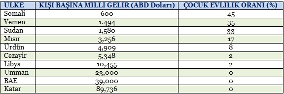 Araştırmalara göre en fazla kız çocuk evlilikleri, kişi başına yıllık gelirin 1,600 dolardan az olduğu, en yoksul Yemen, Sudan ve Somali gibi ülkelerde görülmektedir. Aşağıdaki tabloda görüldüğü gibi kişi başına düşen milli gelir arttıkça kız çocuk evlilik oranı önemli ölçüde azalmaktadır. Tabloda yer alan bütün ülkelerde İslam dininin hâkim din olması ve kız çocuk evlilik oranlarındaki büyük farklar göz önüne alındığında, kız çocuk evliliklerinin nedeni kesinlikle din olamaz.