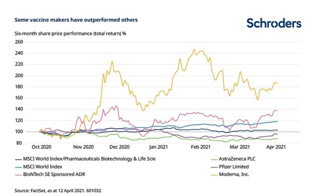 12 Nisan 2021 itibarıyla; AstraZeneca, Pfizer ve Moderna ilaç şirketlerinin performansları. Kaynak: FactSet.