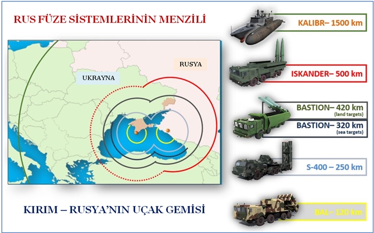Rusya, ilhak ettiği Kırım’a konuşlandırdığı füze sistemleri sayesinde bütün potansiyel rakiplerini bu bölgeden uzak tutma imkân ve kabiliyetine sahiptir. Rusya, şekilde görülen füze sistemlerine ilave olarak orta menzilli BUK-2, TOR-2 ve PANTSIR hava savunma sistemlerini de Kırım’da konuşlandırmayı planlamaktadır.