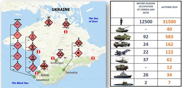 Rusya 2014 yılında Kırım’ı ilhak ettikten sonra, asker sayısını 31,500’e çıkarmanın yanı sıra aşağıdaki tabloda da görüldüğü gibi silah sistemlerinin sayısını da artırmıştır. Rusya’nın ilhak ettiği Kırım’daki askeri varlığını 2025 yılına kadar 1.5 kat daha artırması beklenmektedir.