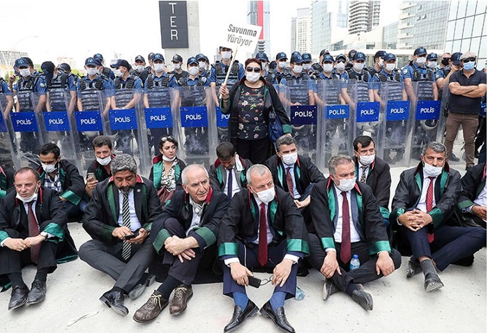 Baroların örgütlenmesini düzenleyen yasa tasarısını protesto eden avukatlar, 22 Haziran 2020 tarihinde Ankara’da, yolu kapatan Türk çevik kuvvet polisi önünde oturma eylemi yaparken. Fotoğraf: Adem Altan/AFP.