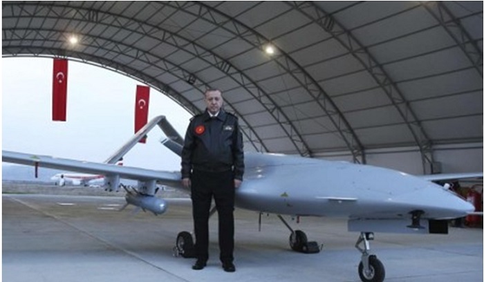Türkiye son yıllarda yaptığı hamlelerle dron süper güç statüsüne yükselmiştir. Bayraktar İHA önünde poz veren Türkiye Cumhurbaşkanı Recep Tayyip Erdoğan.