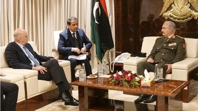 Yunanistan Dışişleri Bakanı Nikos Dendias ve Libya Ulusal Ordusu lideri Mareşal Khalifa Belqasim Haftar. Görüşme sonrası Yunanistan Dışişleri Bakanlığı tarafından yapılan açıklamada: Dendias’ın Benghazi’de Libya Ulusal Ordu lideri Tümgeneral Khalifa Haftar ile görüşmekten büyük mutluluk duyduğu ve ikilinin Tripoli yönetimi ile Türkiye arasında imzalanan iki mutabakat dâhil meseleler hakkında görüştükleri ifade edilmiştir. Kaynak: AMNA