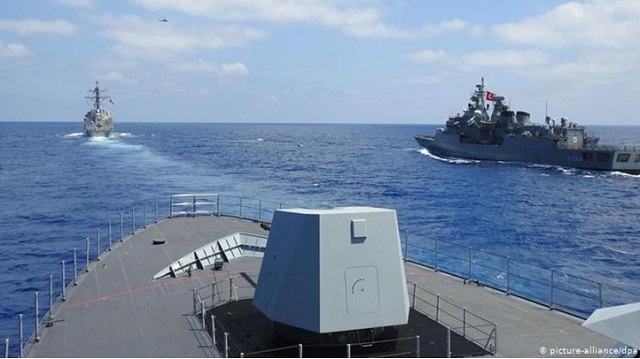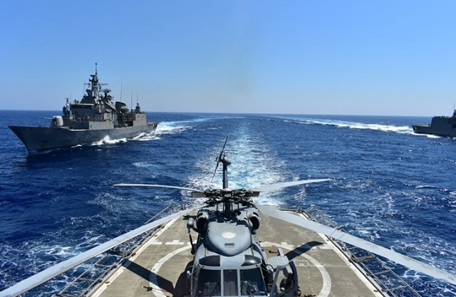 Yunanistan Savunma Bakanlığı tarafından paylaşılan fotoğrafta Doğu Akdeniz’de askeri tatbikata katılan savaş gemileri görülmektedir. 25 Ağustos 2020. Kaynak Yunanistan Savunma Bakanlığı via AP
