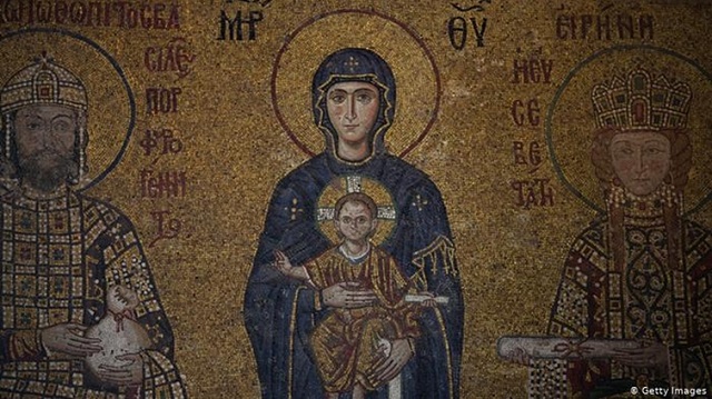 Yunan hükümeti tarafından ‘‘Hagia Sophia, UNESCO altında dünya kültür mirasına aittir. Kuran okuyarak onu camiye dönüştürme girişimi küresel topluma hakarettir’’ açıklaması yapılan müzenin duvarlarında Hıristiyan mirasının izleri. Kaynak: Getty Images.