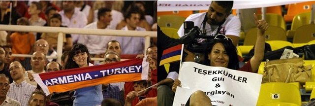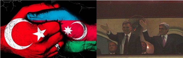 Solda Türkiye-Azerbaycan dostluk ve kardeşliğini simgeleyen bir illüstrasyon, sağda ise Türkiye ile Ermenistan arasında imzalanan tarihi protokolün ardından Bursa’da oynanan milli maçta Ermenistan Cumhurbaşkanı Sarkisyan’ı ağırlayan Türkiye Cumhuriyeti Cumhurbaşkanı Abdullah Gül görülmektedir.