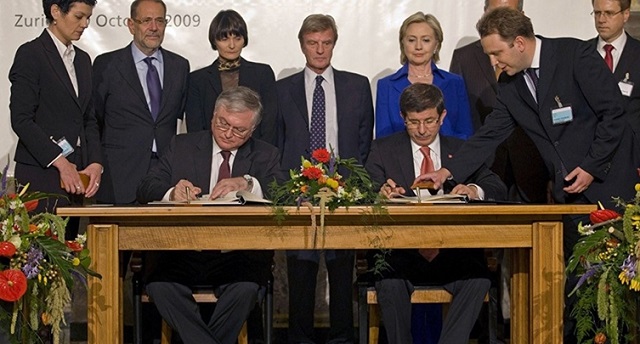 Türkiye ile Ermenistan arasında 11 Ekim 2009 tarihinde, İsviçre’nin arabuluculuğu ile ‘‘Türkiye Cumhuriyeti ve Ermenistan Cumhuriyeti Arasında İlişkilerin Geliştirilmesine Dair Protokolü’’ ve ‘‘Türkiye Cumhuriyeti ve Ermenistan Cumhuriyeti Arasında Diplomatik İlişkilerin Kurulması Protokolü’’ imzalanmış, Ermenistan 2018 yılında verdiği bir kararla ‘‘BEYHUDE’’ olarak nitelendirdiği protokolleri iptal etmiştir. Fotoğraf: NTV