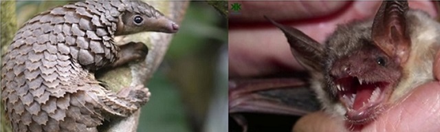 Solda virüsü insanlara bulaştırdığı düşünülen pangolin hayvanı, sağda ise yarasa hayvanı