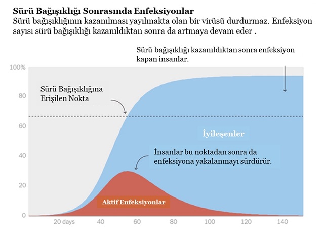 Aksine, korona virüs gibi yeni bir patojen kontrolsüz olarak yayılmaya bırakıldığında, sürü bağışıklığı bulaşmanın yayılmayı durdurduğu değil, sadece yayılmanın yavaşlamaya başladığı noktaya ulaşıldığına delalet eder. Bergstrom ve Dean bu durumu; kontrolden çıkan ve hızla gitmekte olan bir trenin yokuşun başladığı bir yere geldiğinde aniden durmaması gibi hızla yayılmakta olan bir virüsün de sürü bağışıklığı kazanılır kazanmaz durmayacağı örneği ile açıklamaktadır. Epidemiyoloji uzmanları sürü bağışıklığının kazanılması sonrasında ortaya çıkan bu ilave enfeksiyonları ‘‘aşımlar’’ olarak adlandırmaktadır.