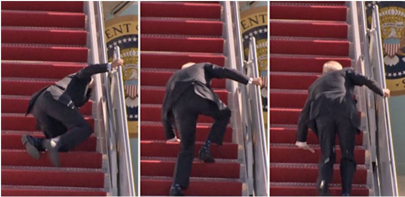 Fotoğrafta Air Force One uçağının merdivenlerinde tam üç kez düşen Amerika Birleşik Devletleri Başkanı Joe Biden görülmektedir. Beyaz Ev tarafından yapılan açıklamada başkanın %100 sağlıklı olduğu, düşmesinin nedeninin ise saatte 19 mph şiddetinde esen rüzgâr olduğu ifade edilmiştir. Mart 2021. Kaynak: Daily Mail Online