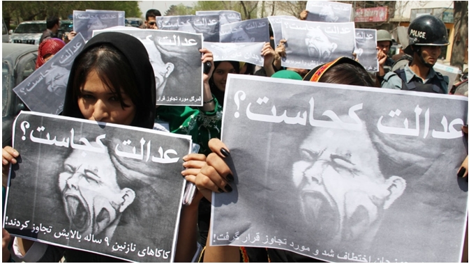Kadına yönelik şiddeti protesto eden Afganlı kadınlar. Kaynak: Sabawoon/RFE/RL