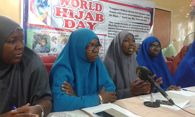 Nijerya’da Dünya Başörtüsü Günü nedeniyle bir basın toplantısı düzenleyen kadınlar, erkeklere hitap ederek sorunlarını dile getirmişlerdir. Kaynak: The Gazelle News