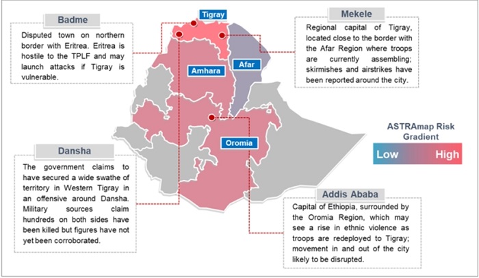 Tigray, Amhara ve Afar eyaletlerindeki çatışmalar ve risk seviyeleri. Kaynak: SIBYLLINE