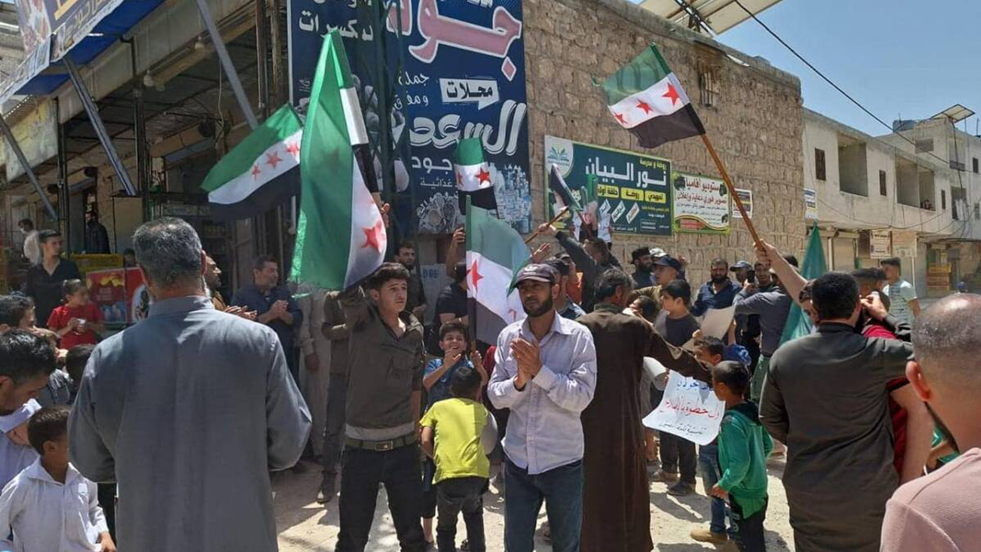 Suriye’nin kuzeybatısında düzenlenen HTS karşıtı gösterilerde protestocular, HTS lideri Abu Muhammad al-Jolani’nin istifasını, hapishanelerdeki tutukluların serbest bırakılmasını ve çeşitli reformların yapılmasını talep etmişlerdir. 17 Mayıs 2024. Kaynak: Macro Media Center