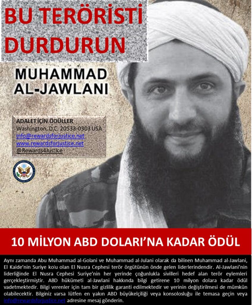 El Kaide’den ayrıldığını ilan etmesine ve ismini değiştirmesine rağmen HTS, Birleşmiş Milletler, ABD, İngiltere ve diğer ülkeler tarafından terör örgütü olarak tanımlanmaya devam etmiş ve ABD, Jolani ile ilgili bilgi verenlere 10 milyon dolara kadar ödül vereceğini ilan etmiştir.