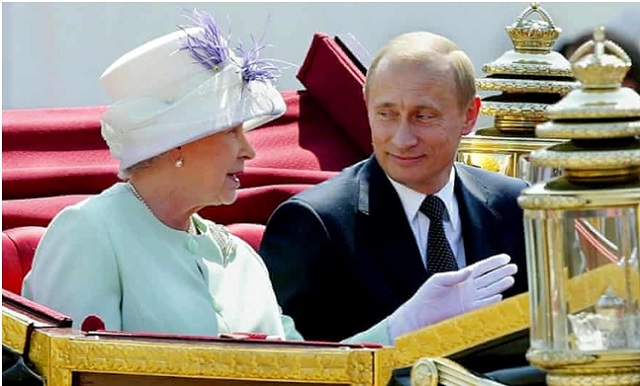 Vladimir Putin ve randevusuna 14 dakika geç geldiği Kraliçe Elizabeth 2003 yılında Londra’da görülürken. Fotoğraf: Nicolas Asfouri/AFP/Getty Images