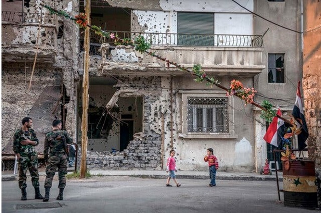 Suriye’nin Homs kentinde 2014 yılından bir kontrol noktasındaki askerler ve çocukların görüntüsü. Theo Padnos birçoğu Suriye’nin diktatör lideri Bashar al-Assad yönetiminde zalimleşen kendisini esir alanlar ile mümkün olabildiğince dostluk kurmuştur. Fotoğraf: Sergey Ponomarev/The New York Times
