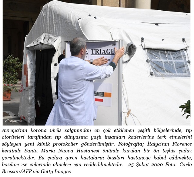 İtalya’nın kuzeyindeki Turin kentinden bir kriz yönetim birimi tarafından hazırlanan bir dokümanda da yeterli yatak olmadığı durumlarda, 80 yaş ve üstündeki korona virüs kurbanlarına veya sağlık durumu kötü olanlara yoğun bakım ünitesi tedavisi uygulanmaması önerilmektedir.