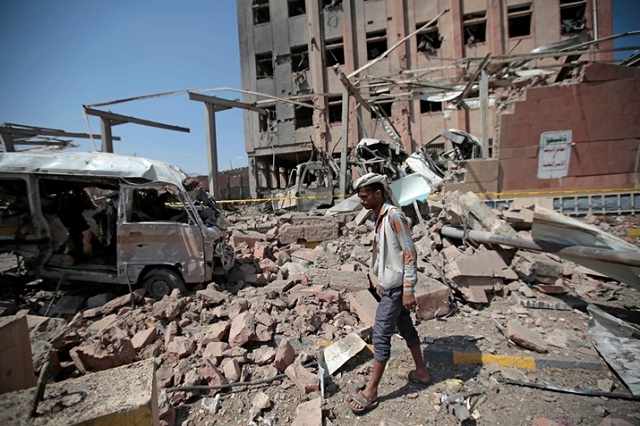 Suudi Arabistan liderliğindeki koalisyon güçlerinin Sanaa’ya gerçekleştirdiği hava saldırısı sonrasında kalıntıların arasında dolaşan Yemenli bir adam. Kaynak: Hani Mohammed/AP.